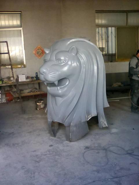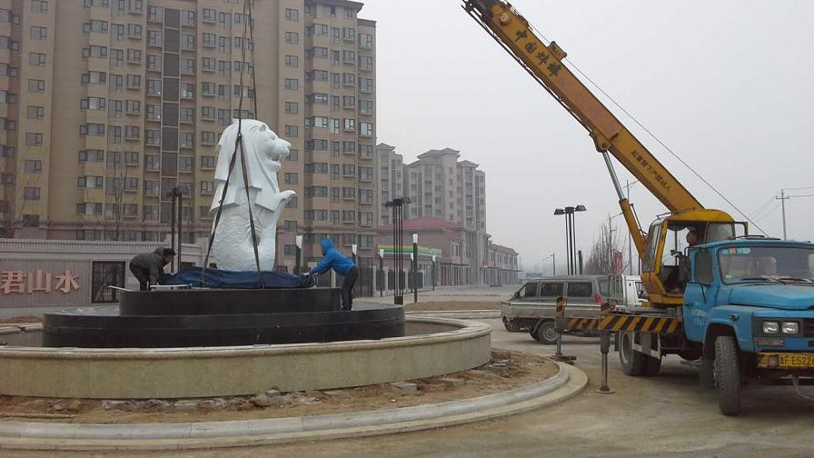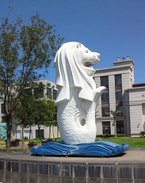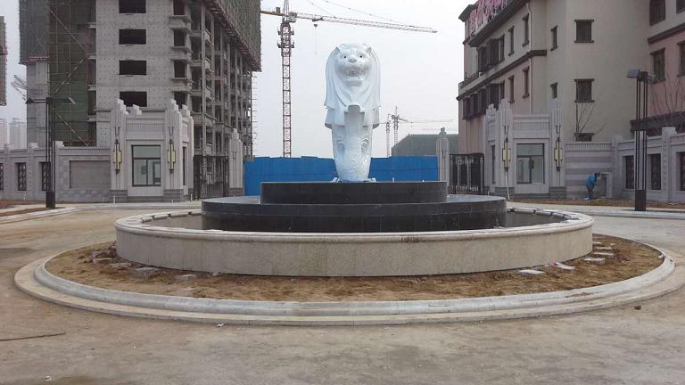 烟台中青君山水小区 鱼尾狮雕塑水景 材质:不锈钢