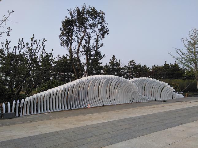 烟台《招商-依云水岸》海浪不锈钢雕塑景观, 采用现代雕塑语言设计,以楼盘形象、定位,整体设计配套。不锈钢制作主体,白色氟碳漆饰面。效果表现现代感较强,对应楼盘位于海边特点,总数三组约60余米。昌林雕塑(13853539222 微信同号)2018-4-28制作。