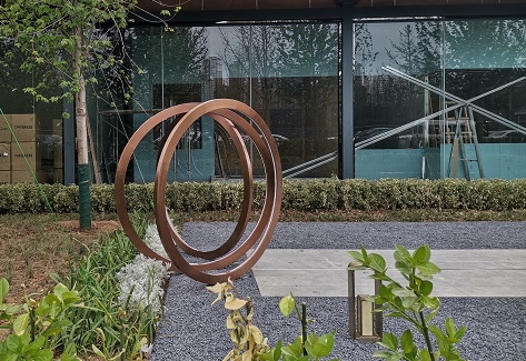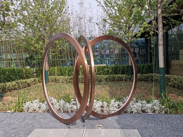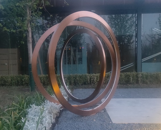 雕塑位于烟台滨湖万丽售楼处,雕塑形式简洁,采用优质不锈钢造型电镀玫瑰金工艺,内置灯槽,配灯光装饰。三个圈子看似简单,工艺不简单。造型搭配有变化,是一件设计理念现代,做工精细的抽象雕塑景观小品。和环境相得益彰,位于售楼处花园甬路小径的尽端。提高了周边景观氛围,是烟台雕塑的成功之作。