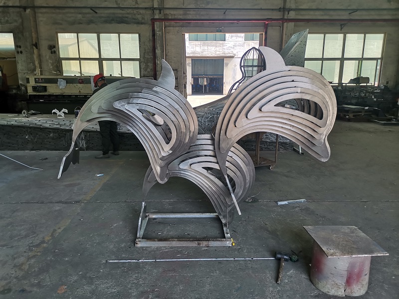 烟台雕塑 烟台开发区乐橙小区不锈钢雕塑  海豚雕塑 材质2mm304不锈钢 拉丝 昌林雕塑2023年制作安装